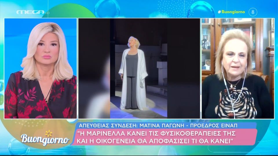 Για την Μαρινέλλα είπε πως: «κάνει τις φυσικοθεραπείες της. Από εκεί και πέρα θα αποφασίσει η οικογένειά της πώς θα διαχειριστεί σε ποιο κέντρο αποκατάστασης θα πάει». «Στην Ελλάδα είναι πολλά τα κέντρα αποκάταστασης και είναι καλά», τόνισε η Ματίνα Παγώνη.