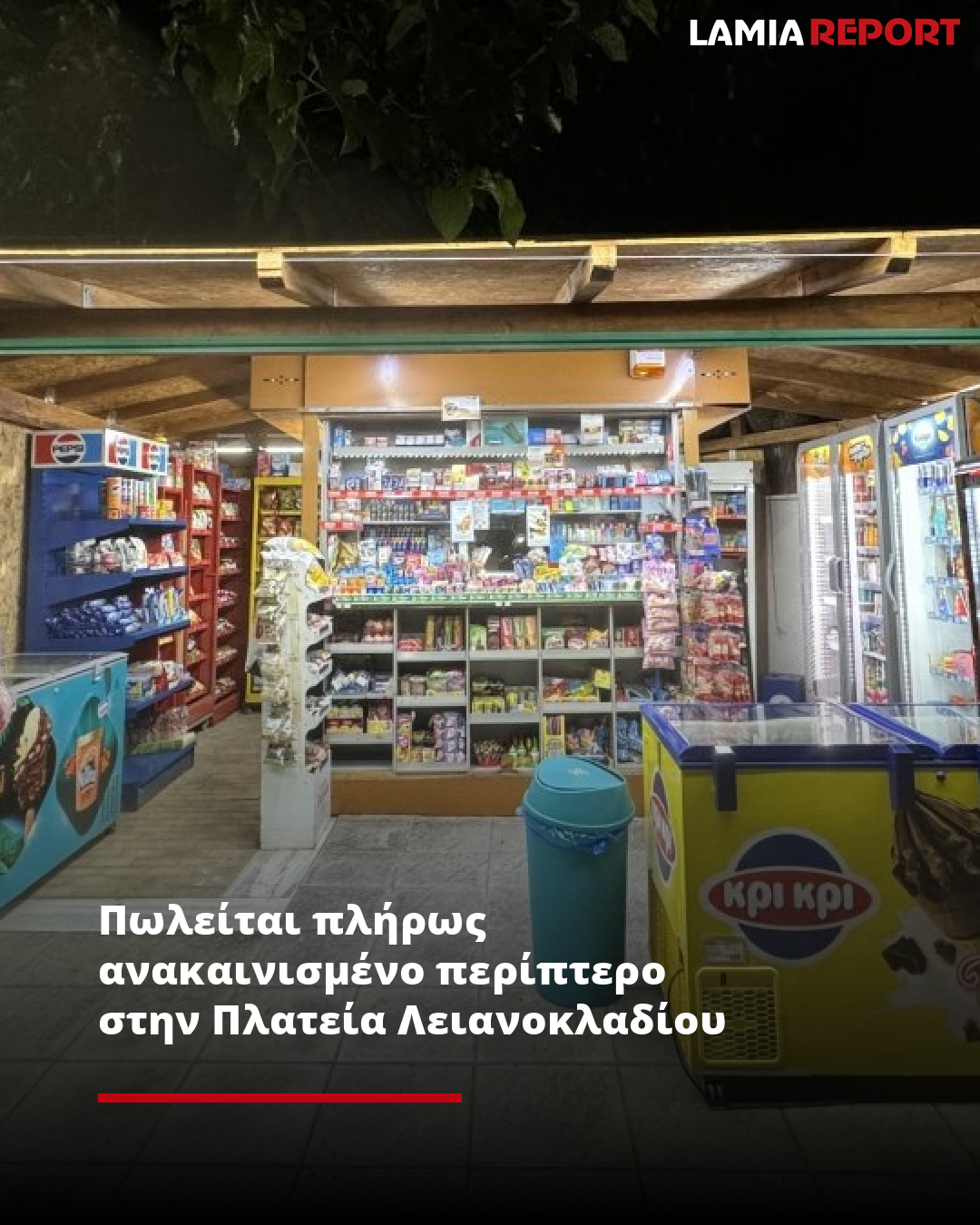 Πωλείται πλήρως ανακαινισμένο περίπτερο σε εξαιρετικό και δυναμικό σημείο, στην Πλατεία Λειανοκλαδίου, επί της Εθνικής Οδού Λαμίας – Καρπενησίου, στo Λειανοκλάδι Φθιώτιδας.