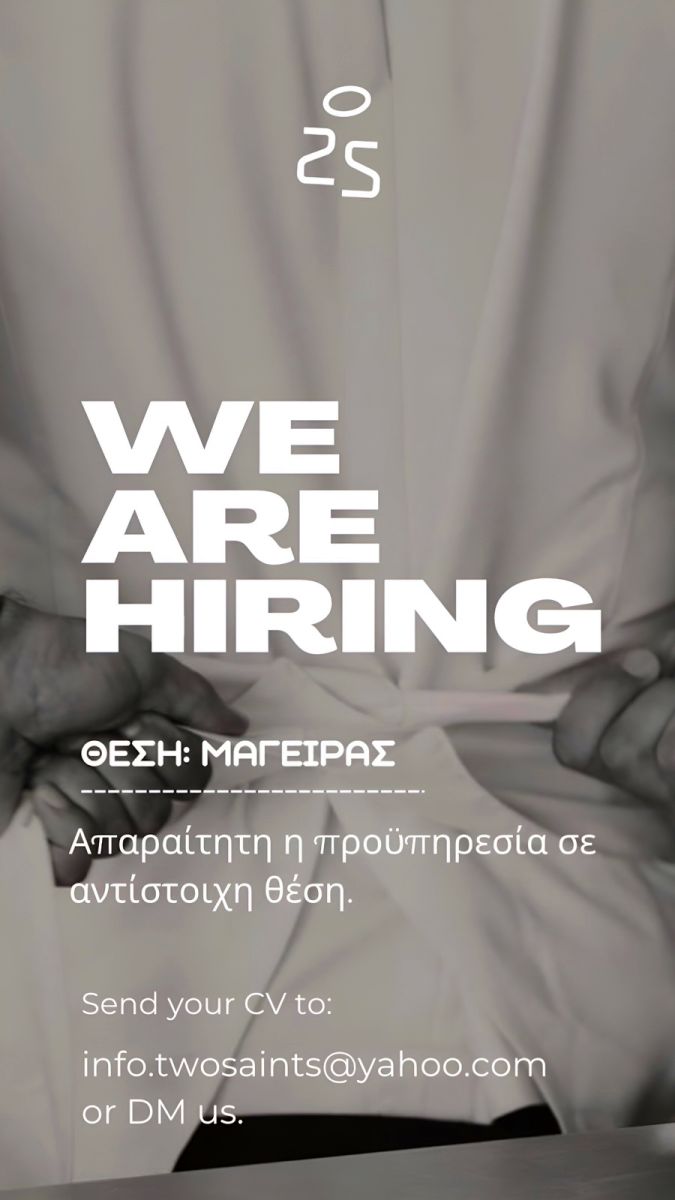 Ζητείται μάγειρας από το 2Saints, που βρίσκεται στην πλατεία Ελευθερίας, στο κέντρο της Λαμίας.