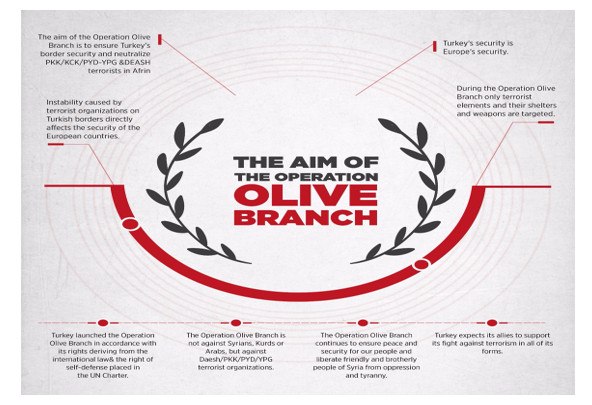 - Η Τουρκία επικαλούνταν ότι διεξήγαγε τις εν λόγω Επιχειρήσεις για να εκδιώξει τους Τζιχαντιστές και τις τρομοκρατικές οργανώσεις ΡΚΚ, KCK, PYD, YPG, από την περιοχή του Αφρίν συμβάλλοντας παράλληλα, και στην πάταξη της παγκόσμιας τρομοκρατίας. Για την εξυπηρέτηση του αφηγήματός της μάλιστα, είχε πλαισιώσει τους πάντες ως τρομοκράτες (π.χ. οι Κούρδοι του PKK, ενώ τα προηγούμενα χρόνια είχαν ενεργό συμμετοχή στην Παγκόσμια Εκστρατεία κατά του ISIS, από την Τουρκία, αποκαλούνταν τρομοκράτες και μέλη του ISIS). Τα τελευταία γεγονότα έδειξαν, ότι η Τουρκία όχι μόνο δεν εκδίωκε τους τρομοκράτες και τους Τζιχαντιστές, αλλά συνεργάζονταν μαζί τους και τους χρησιμοποίησε ως αντιπροσώπους της (proxy), για να ανατρέψει τον Άσαντ.
