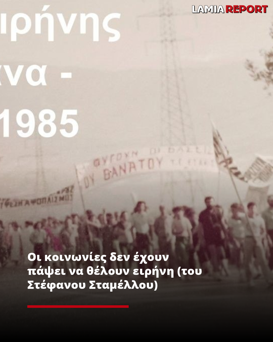 ΥΓ: Η φωτογραφία είναι από την ΠΟΡΕΙΑ ΕΙΡΗΝΗΣ ΑΛΑΜΑΝΑ – ΛΑΜΙΑ, 14χιλ, που έκανε η Ελληνική Επιτροπή για τη Διεθνή Ύφεση και Ειρήνη (ΕΕΔΥΕ) το 1985. Διακρίνονται τα συνθήματα "ΕΙΡΗΝΗ ΥΦΕΣΗ ΑΦΟΠΛΙΣΜΌΣ", "ΝΑ ΦΥΓΟΥΝ ΟΙ ΒΑΣΕΙΣ ΤΟΥ ΘΑΝΑΤΟΥ". Πάντα επίκαιρα.
