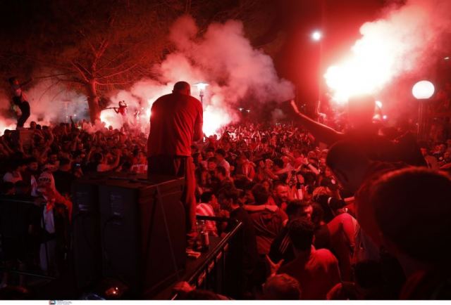 Με το που σφύριξε ο Πορτογάλος διαιτητής την λήξη του τελικού χιλιάδες φίλοι των ερυθρόλευκων που παρακολουθούσαν το παιχνίδι από τις γιγαντοοθόνες που είχαν στηθεί σε τρεις περιοχές του Πειραιά ξέσπασαν σε ξέφρενους πανηγυρισμούς με την νύχτα να γίνεται ημέρα.