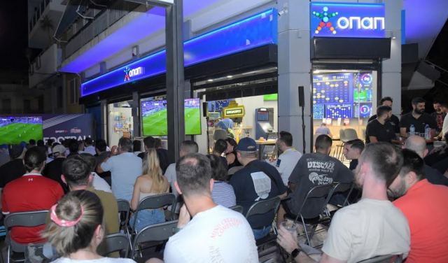 Η ατμόσφαιρα στο κατάστημα ΟΠΑΠ της οδού Τζαβέλλα 111 ήταν γηπεδική, με δεκάδες φιλάθλους να έχουν στήσει κερκίδα και να ζουν την ένταση του αγώνα.