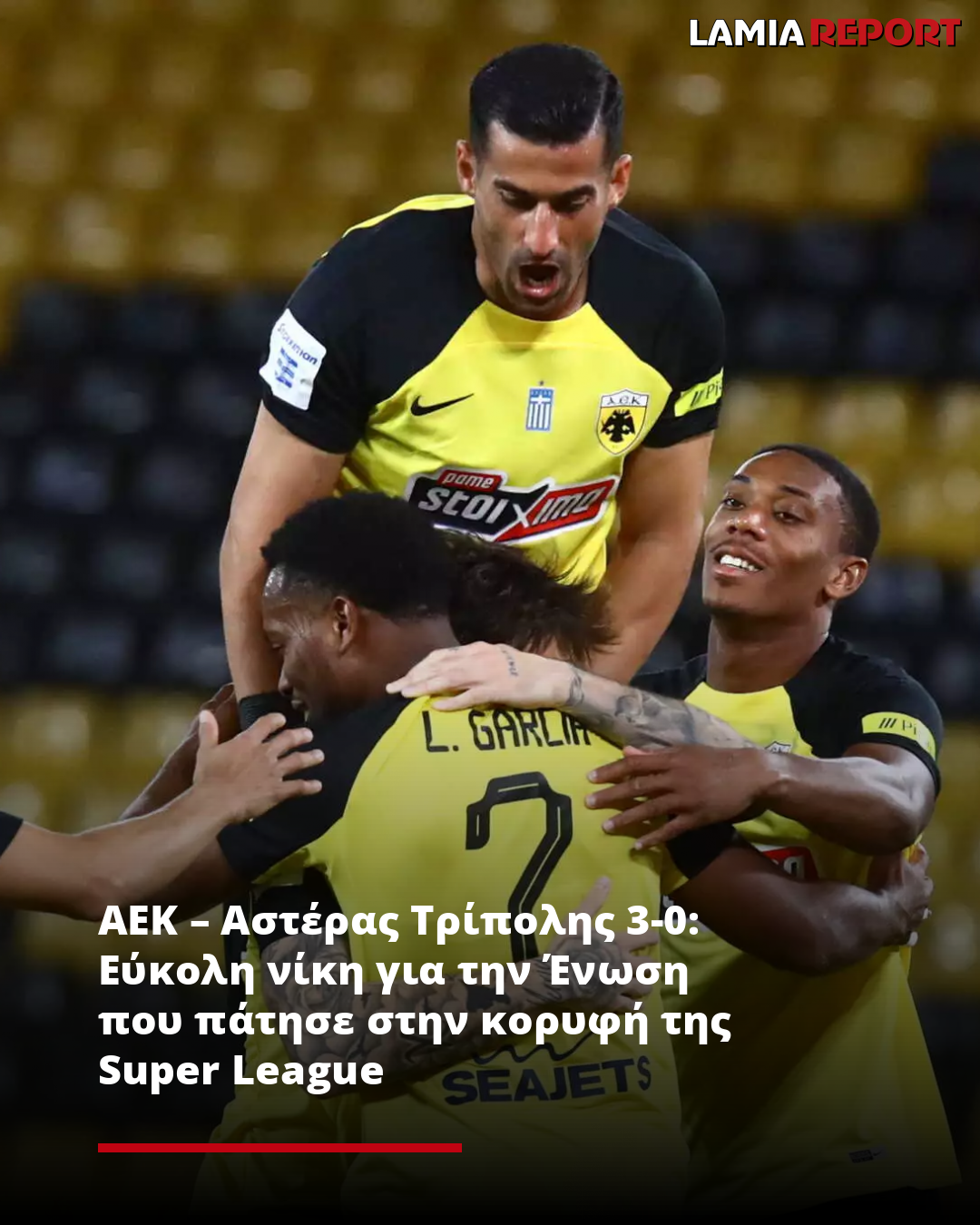 Η ΑΕΚ κέρδισε 3-0 τον Αστέρα Τρίπολης στην άδεια λόγω τιμωρίας «OPAP Arena» με την Ένωση να ανεβαίνει στην 1η θέση της Super League. Χατζισαφί, Φερνάτες και Λιβάι Γκαρσία τα γκολ των «κιτρινόμαυρων» με τους φιλοξενούμενους να ολοκληρώνουν το παιχνίδι με 9 παίκτες.