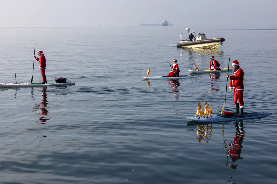 Το κάλεσμα ήταν ανοιχτό και η ανταπόκριση μεγάλη. Δεκάδες άνθρωποι με στολές Άι-Βασίλη μπήκαν στα νερά του Θερμαϊκού πάνω στις σανίδες SUP, χαρίζοντας μια πραγματικά όμορφη και εντυπωσιακή εικόνα, γεμάτη από ανεμελιά και χριστουγεννιάτικη διάθεση.