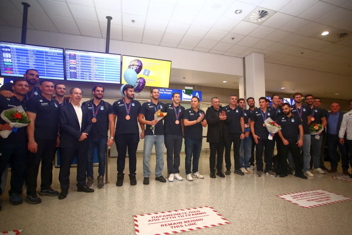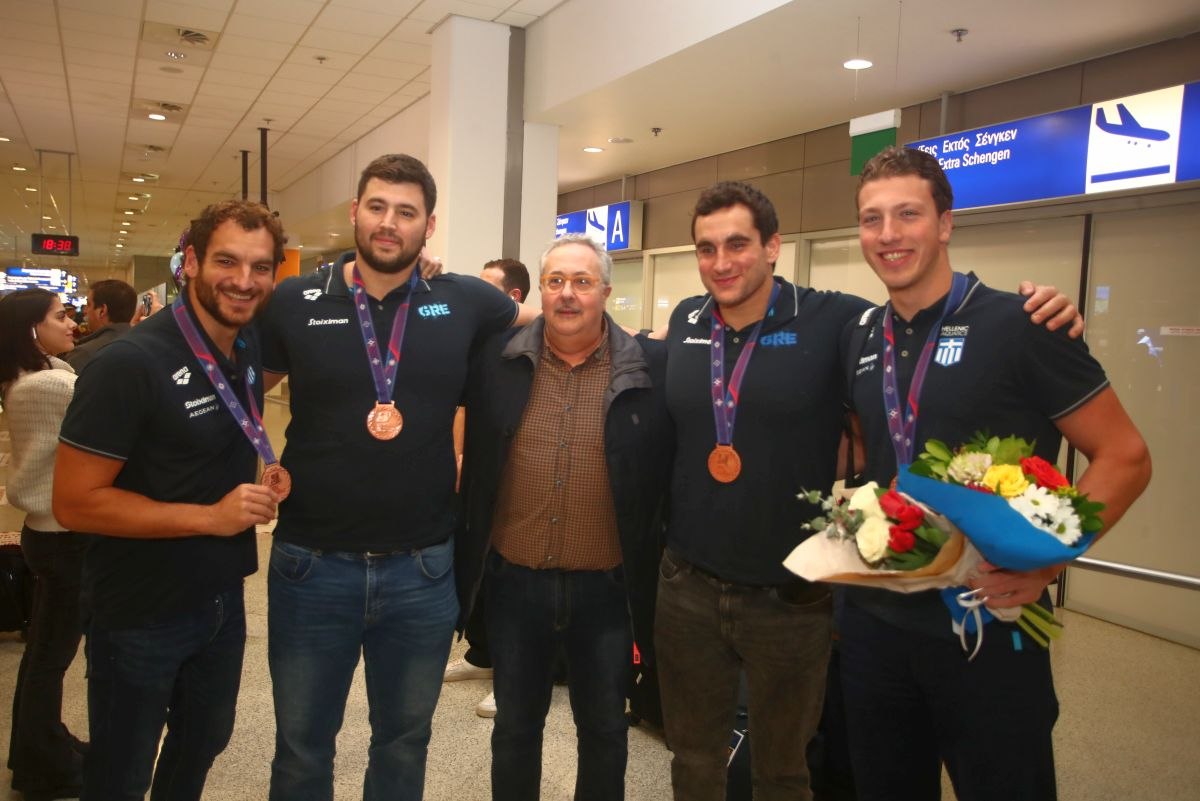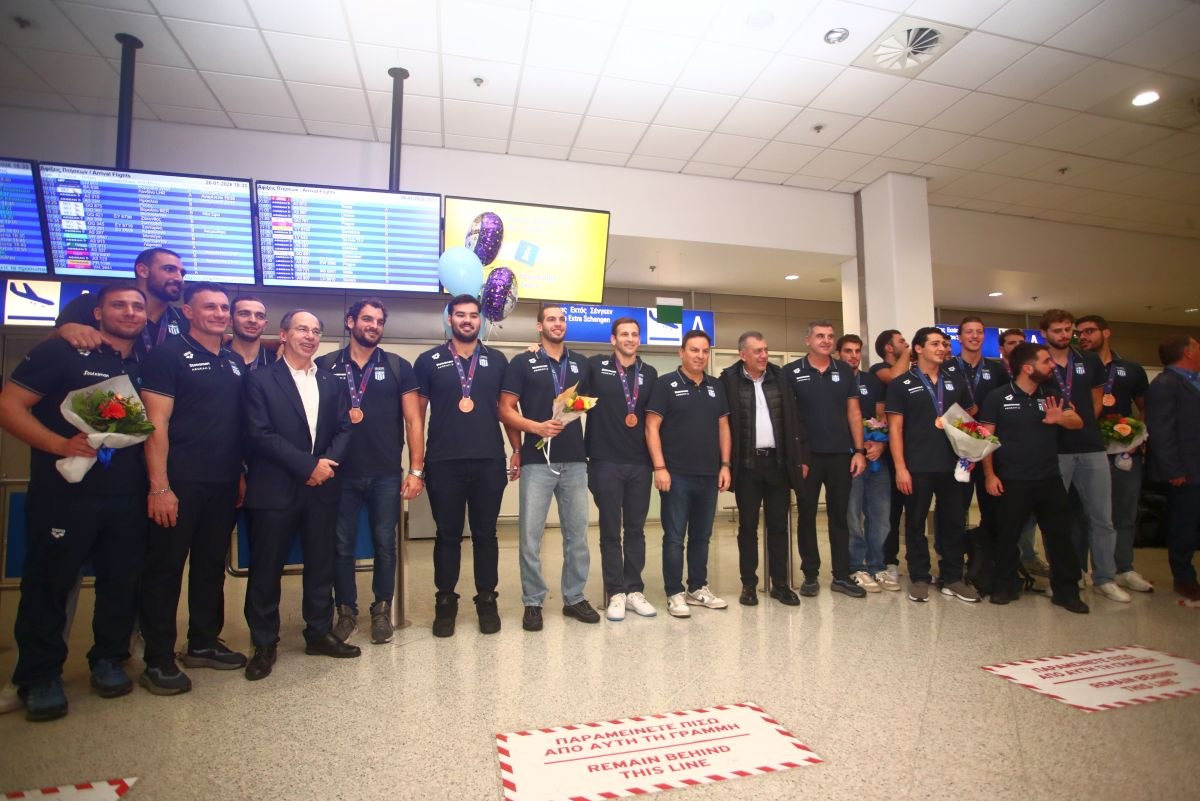 Το αντιπροσωπευτικό μας συγκρότημα έφτασε στο αεροδρόμιο «Ελευθέριος Βενιζέλος» προερχόμενο από το Βελιγράδι, όπου οι παίκτες του Θοδωρή Βλάχου απέδειξαν για άλλη μια φορά ότι ανήκουν στην παγκόσμια ελίτ. Την αποστολή υποδέχθηκαν επίσημα ο Υπουργός Αθλητισμού, Γιάννης Βρούτσης, και ο Γενικός Γραμματέας Αθλητισμού, Γιώργος Μαυρωτάς, τιμώντας τη νέα διάκριση του ελληνικού πόλο.