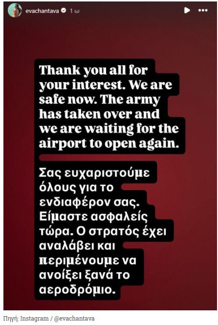 «Σας ευχαριστούμε όλους για το ενδιαφέρον σας. Είμαστε ασφαλείς τώρα. Ο στρατός έχει αναλάβει και περιμένουμε να ανοίξει ξανά το αεροδρόμιο», έγραψε στην ανάρτηση της στο Instagram.