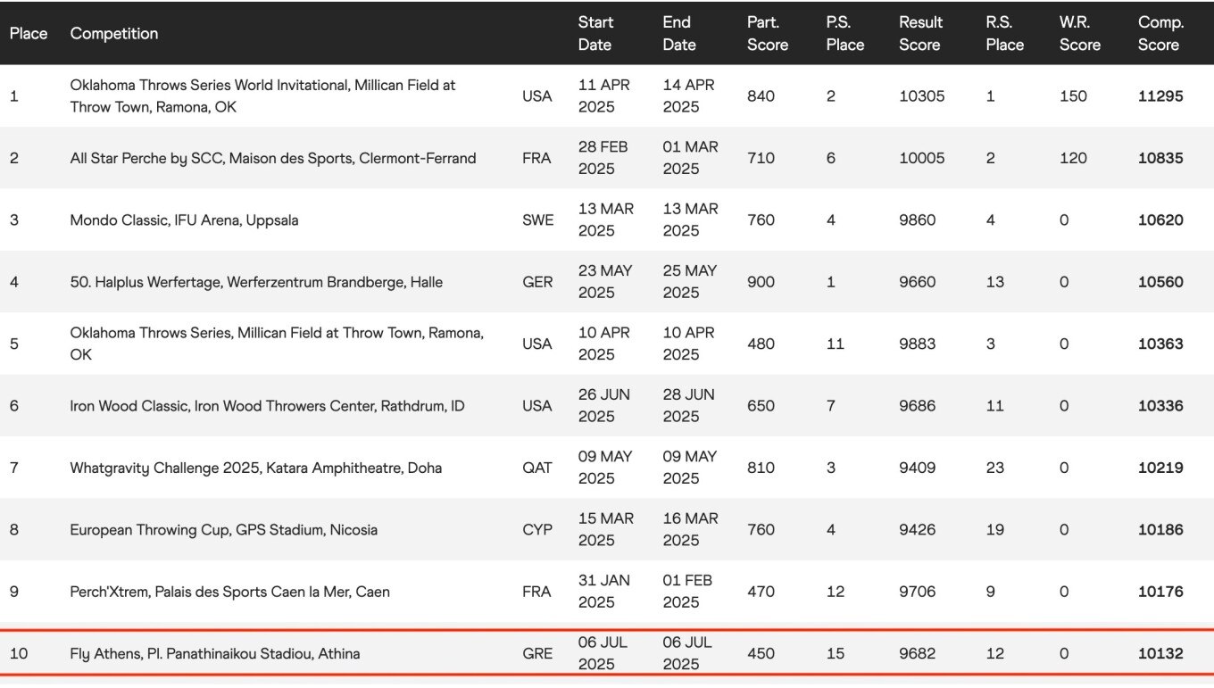 Αξίζει να αναφέρουμε πως στο Νο8 βρίσκεται στο Ευρωπαϊκό κύπελλο ρίψεων που φέτος διοργανώθηκε με επιτυχία στην Κύπρο ενώ το επόμενο ελληνικό μίτινγκ στη λίστα είναι το μίτινγκ μήκους σε δημόσιο δρόμο του Λούη Τσάτουμα (Tsatoumas Street Long Jump) που βρίσκεται στη θέση Νο48 και ακολουθεί στη θέση Νο53 το Filothei Women Gala.
