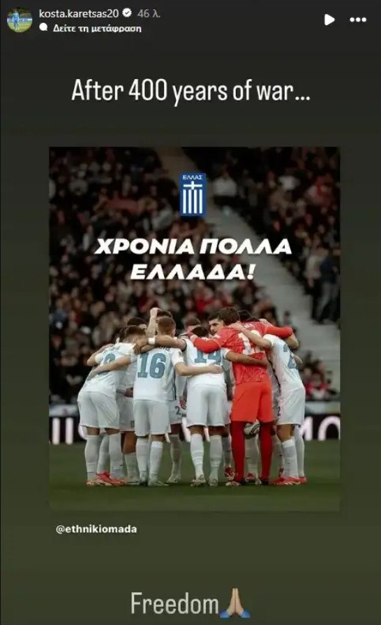 “Χρόνια πολλά Ελλάδα, μετά από 400 χρόνια πολέμου, ελευθερία” σχολίασε, κάνοντας repost μια ανάρτηση της Εθνικής ποδοσφαίρου.