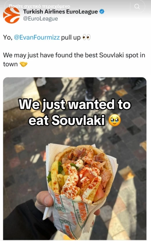 Η Euroleague έστειλε το δικό της μήνυμα στον Φουρνιέ, γράφοντας χαρακτηριστικά: «Ει Εβάν, εμφανίσου. Βρήκαμε το καλύτερο σουβλάκι στην Αθήνα». Μένει να δούμε αν θα το εγκρίνει και ο ίδιος!