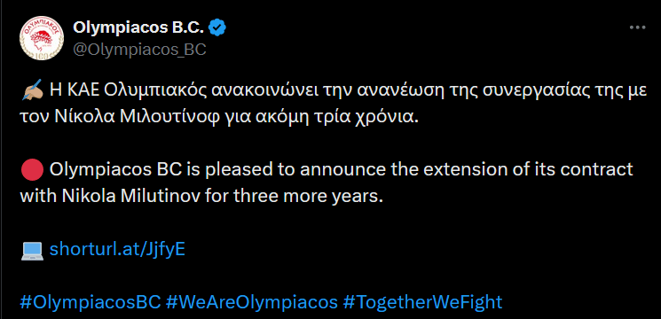 Παρέμεινε στο… λιμάνι του! Ο Ολυμπιακός επισημοποίησε την συμφωνία με τον Νίκολα Μιλουτίνοφ, με τον Σέρβο σέντερ να υπογράφει νέο συμβόλαιο με τους Πειραιώτες, τριετούς διάρκειας.