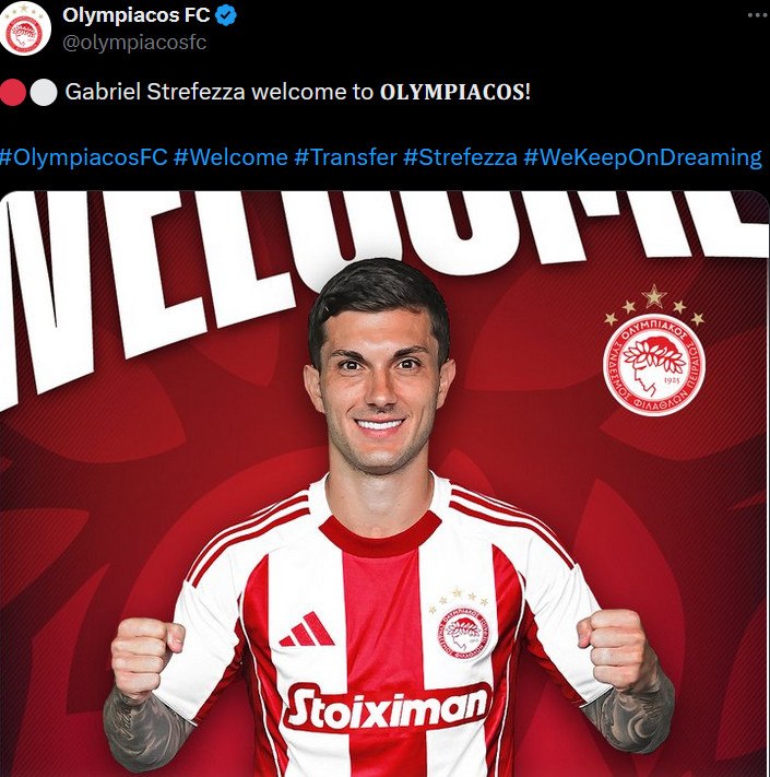 «Η ΠΑΕ Ολυμπιακός ανακοινώνει την απόκτηση του Γκάμπριελ Στρεφέτσα. Ο Βραζιλιάνος εξτρέμ γεννήθηκε στο Σάο Πάουλο, στις 18 Απριλίου 1997.