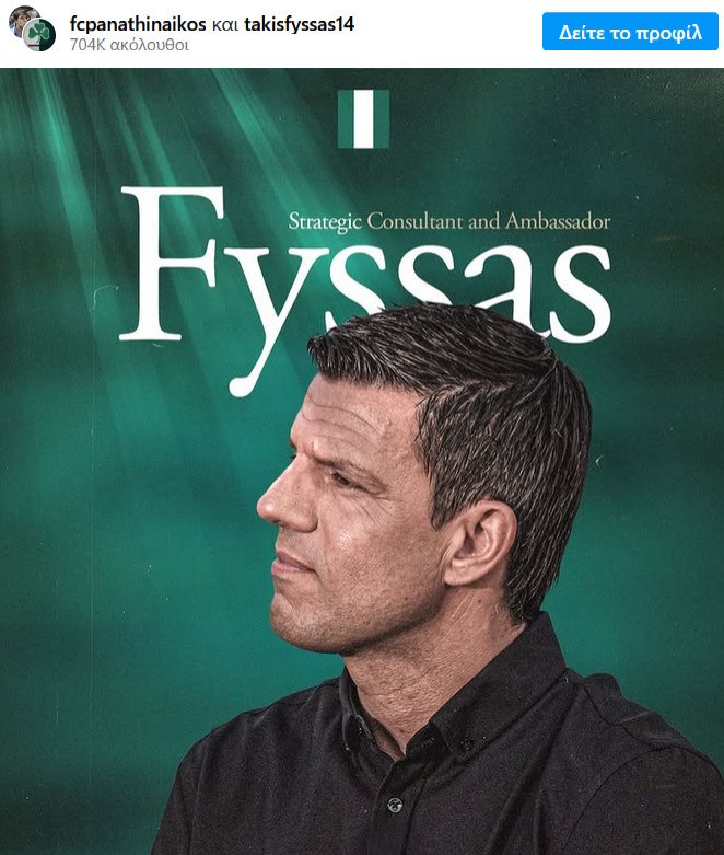 «Η ΠΑΕ Παναθηναϊκός ανακοινώνει την έναρξη της συνεργασίας της με τον Τάκη Φύσσα, ο οποίος αναλαμβάνει άμεσα καθήκοντα συμβούλου στρατηγικού σχεδιασμού του ποδοσφαιρικού τμήματος, καθώς και πρέσβη του συλλόγου.