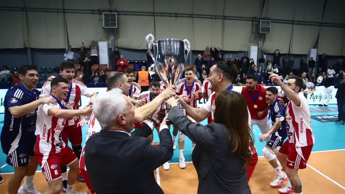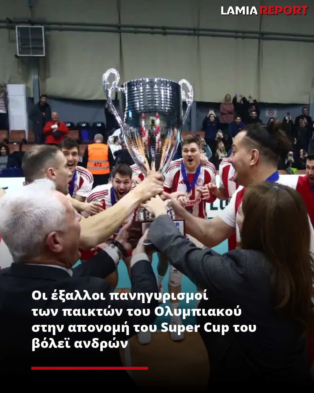 Οι έξαλλοι πανηγυρισμοί των παικτών του Ολυμπιακού στην απονομή του Super Cup του βόλεϊ ανδρών