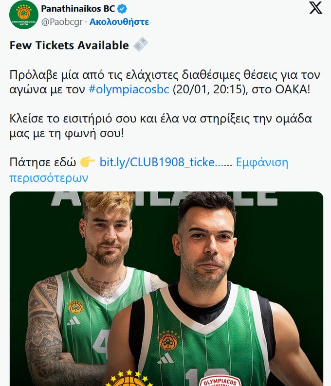 Πρόλαβε μία από τις ελάχιστες διαθέσιμες θέσεις για τον αγώνα με τον Ολυμπιακό (20/01, 20:15), στο ΟΑΚΑ! Κλείσε το εισιτήριό σου και έλα να στηρίξεις την ομάδα μας με τη φωνή σου!” αναφέρουν χαρακτηριστικά οι “πράσινοι”.