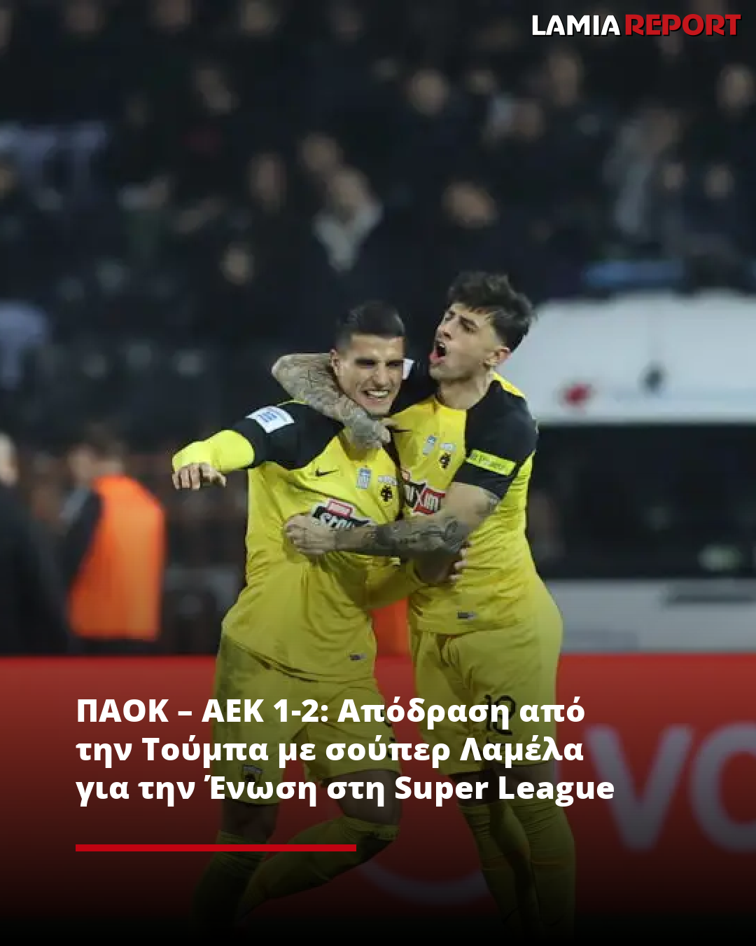 Με ένα ασύλληπτο γκολ του Λαμέλα στο 37′ και ένα δεύτερο με τη βοήθεια αμυντικού στο 48′, χάρισαν τη νίκη στην ΑΕΚ, αφού ο ΠΑΟΚ μείωσε με τον Μπάμπα αμέσως μετά, αλλά έχασε σημαντικές ευκαιρίες για ένα δεύτερο γκολ και τελικά δεν απέφυγε την ήττα στην 21η αγωνιστική της Super League.