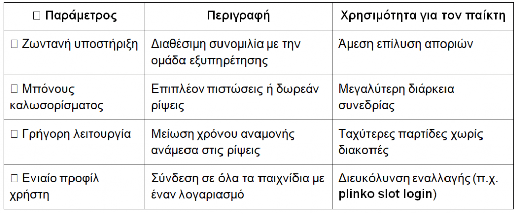 Ο πίνακας με βοηθάει να θυμάμαι γρήγορα τι αξίζει να ελέγξω όταν βρω ένα καινούργιο site. Για παράδειγμα, η λειτουργία plinko slot login είναι ωραία, γιατί επιτρέπει να συνδέομαι με τον ίδιο λογαριασμό που έχω για άλλα παιχνίδια. Έτσι δεν χρειάζεται νέα εγγραφή. Επίσης, αν ένα site δείχνει plinko casino official, ξέρω ότι ακολουθεί πιο επίσημες διαδικασίες αδειοδότησης.