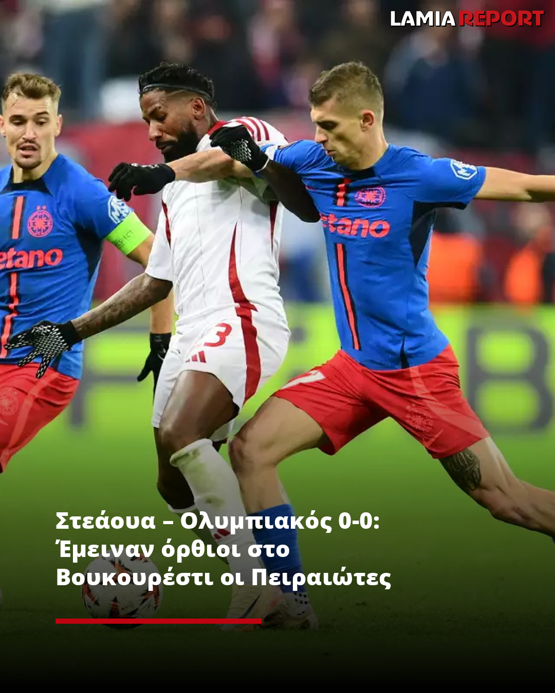 Ο Ολυμπιακός αναδείχθηκε ισόπαλος χωρίς γκολ απέναντι στην Στεάουα Βουκουρεστίου εκτός έδρας, με τους «ερυθρόλευκους» να παίρνουν 1 πόντο, παραμένοντας κοντά με την πρώτη 8αδα της βαθμολογίας η οποία οδηγεί απευθείας στα νοκ – άουτ του Europa League. Αποχώρησε τραυματίας ο Γιάρεμτσουκ, με 10 παίκτες τελείωσαν το παιχνίδι οι γηπεδούχοι λόγω της αποβολής του Μπερλίτσα.