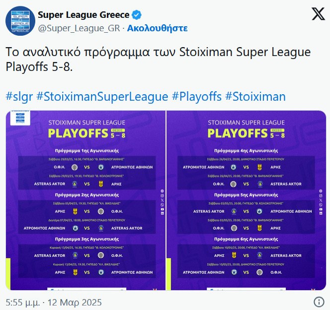 Παράλληλα, η Super League έκανε γνωστό και το αναλυτικό πρόγραμμα των playoffs στις θέσεις 5-8 όπου είναι πιθανό να κριθεί το πέμπτο και τελευταίο ευρωπαϊκό εισιτήριο (εφόσον ΟΦΗ ή Asteras AKTOR δεν κατακτήσουν το Κύπελλο) γνωστοποίησε η Stoiximan Super League.