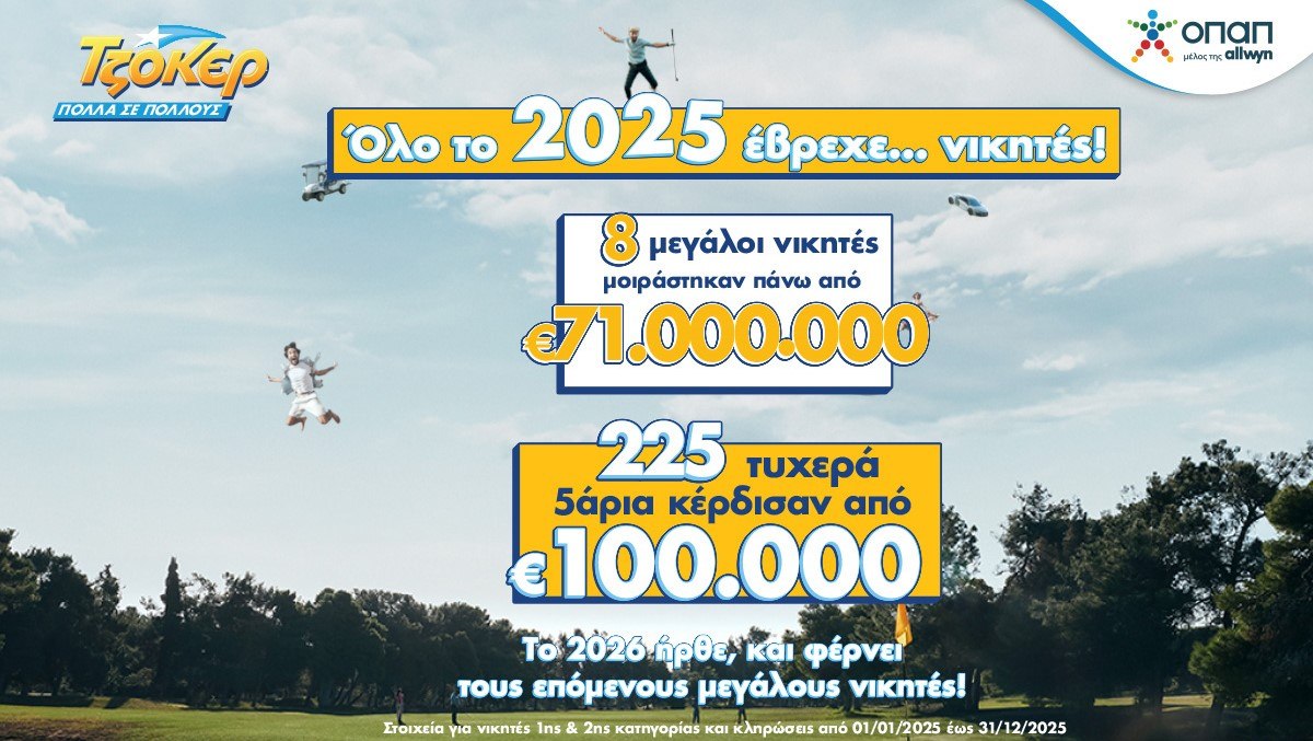 ΤΖΟΚΕΡ: 8 υπερτυχεροί μοιράστηκαν πάνω από 71 εκατ. ευρώ το 2025 – 225 νικητές της δεύτερης κατηγορίας κέρδισαν από 100.000 ευρώ