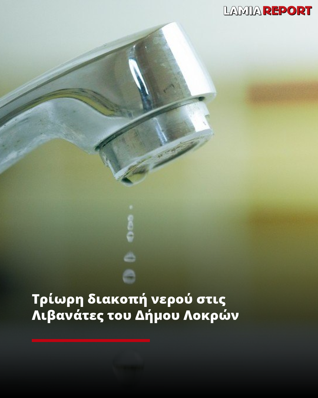 Ο Δήμος Λοκρών ενημέρωσε για διακοπή υδροδότησης λόγω βλάβης του αγωγού στις Λιβανάτες , σήμερα Τετάρτη 20/08/2025 από 09:00 π.μ. και κατ’ εκτίμηση έως 12:00 μ.μ.