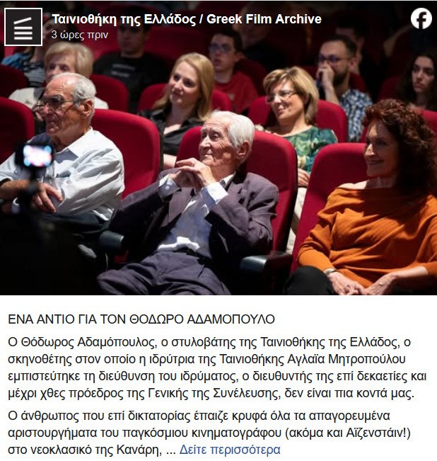 «Ο σκηνοθέτης στον οποίο η ιδρύτρια της Ταινιοθήκης Αγλαΐα Μητροπούλου εμπιστεύτηκε τη διεύθυνση του ιδρύματος, ο διευθυντής της επί δεκαετίες και μέχρι χθες πρόεδρος της Γενικής της Συνέλευσης, δεν είναι πια κοντά μας», αναφέρει το σημερινό ποστ.