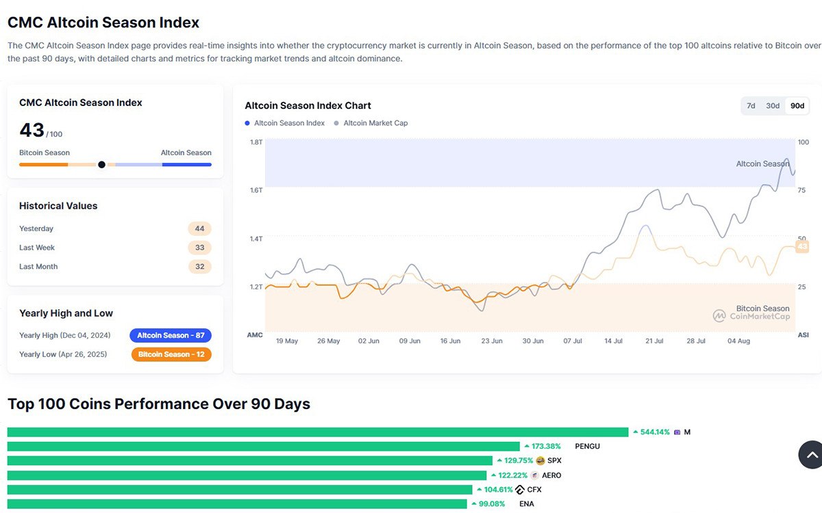 Συγκεκριμένα, ο δείκτης altcoin season έχει αυξηθεί εντυπωσιακά, από το 16 στο 43 μέσα σε δύο μήνες. Αυτό σημαίνει ότι η αγορά πλησιάζει σε πλήρη εποχή των altcoins πολύ σύντομα, μια περίοδο όπου τα altcoins κρυπτονομίσματα ξεπερνούν σε αποδόσεις το Bitcoin.