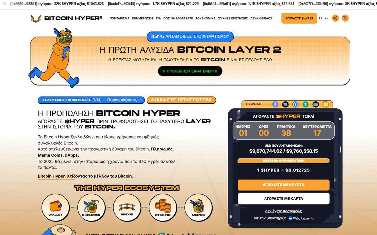 Το Bitcoin Hyper ($HYPER) φέρνει την τεχνολογία του Solana Virtual Machine στο δίκτυο του Bitcoin, επιτρέποντας γρήγορες συναλλαγές και υποστήριξη smart contracts. Πρόκειται για ένα Layer-2 δίκτυο με δυνατότητες staking και bridge για wrapped BTC, το οποίο ανοίγει νέους δρόμους για εφαρμογές DeFi πάνω στο πιο γνωστό blockchain στον κόσμο.
