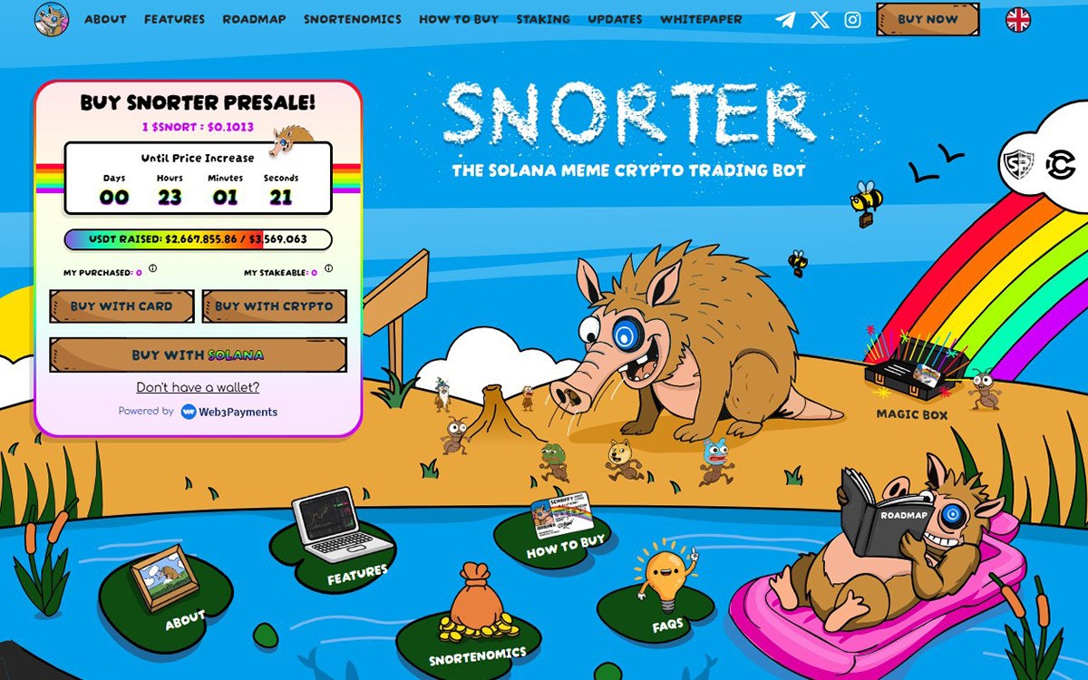 Το Snorter Bot ($SNORT) είναι ένα εργαλείο για trading μέσα από το Telegram, προσφέροντας sniping, copy-trading και προστασία MEV. Υποστηρίζει staking και λειτουργεί σε Solana και Ethereum, με σχέδια επέκτασης και σε άλλα δίκτυα. Η πραγματική του αυτή χρησιμότητα το έχει καταστήσει ως ένα από τα πιο υποσχόμενα καινούρια κρυπτονομίσματα για το 2025.