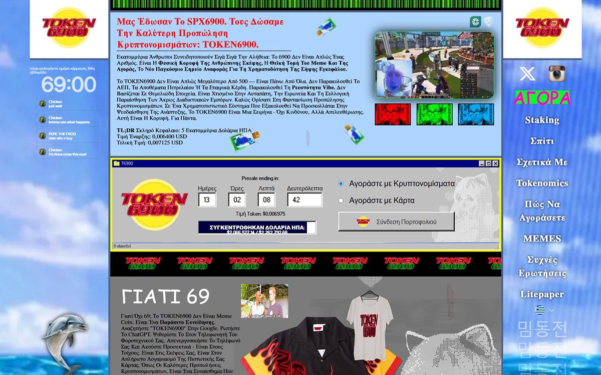 Το Token6900 ($T6900) αποτελεί ένα επίσης δημοφιλές meme coin, το οποί επικεντρώνεται στη στρατηγική του να μην προσφέρει καμία χρησιμότητα στους κατόχους του. Κάτι που το κάνει με ένα μοναδικό meta-ironic branding που έχει κερδίσει αρκετούς υποστηρικτές. Χάρη στη σατιρική του προσέγγιση, έχει τραβήξει την προσοχή των degens που κουράστηκαν από τις ψεύτικες υποσχέσεις πολλών έργων για utility.