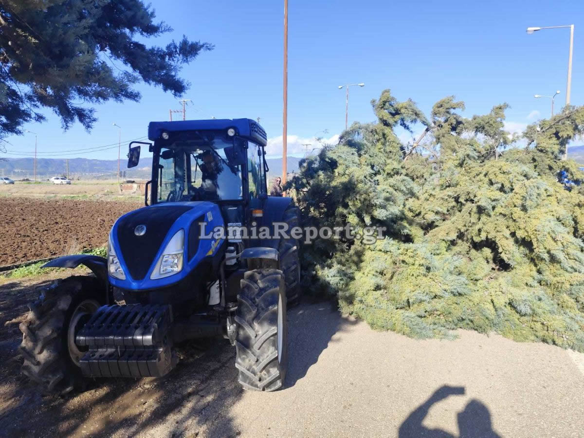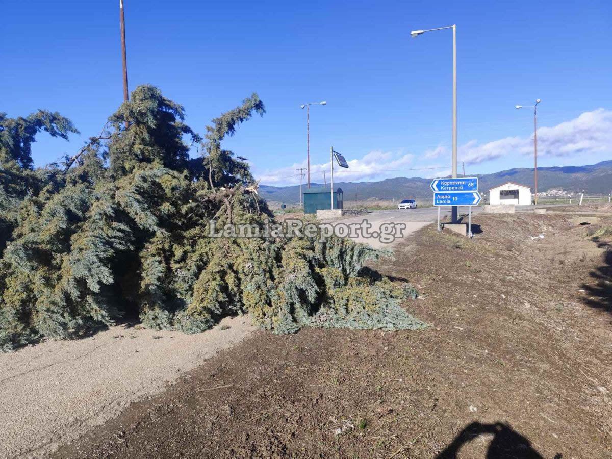 Μεγάλο δέντρο επίσης έπεσε και στο δρόμο Λαμίας - Καρπενησίου, στη διασταύρωση Αμουρίου, αλλά και σε άλλα σημεία εντός και εκτός πόλης.