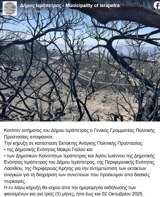 Δεκτό έγινε το αίτημα του Δήμου Ιεράπετρας για την κήρυξη σε κατάσταση έκτακτης ανάγκης οι περιοχές που επλήγησαν από την πυρκαγιά με απόφαση της Πολιτικής Προστασίας.