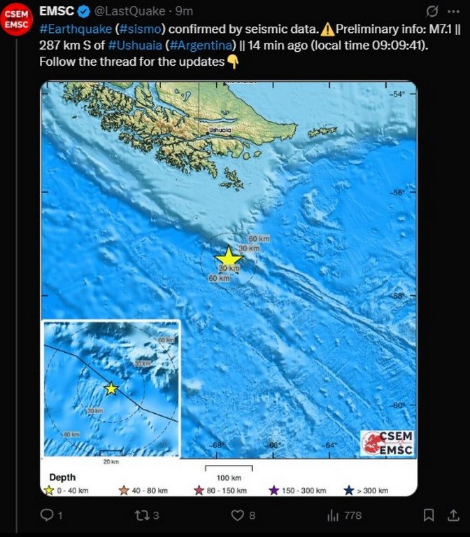 Μεγάλος σεισμός μεγέθους 7,3 Ρίχτερ ταρακούνησε την Αργεντινή, με τις αρχές να προειδοποιούν τις κατοίκους ότι υπάρχει μεγάλος κίνδυνος να δημιουργηθεί τσουνάμι.