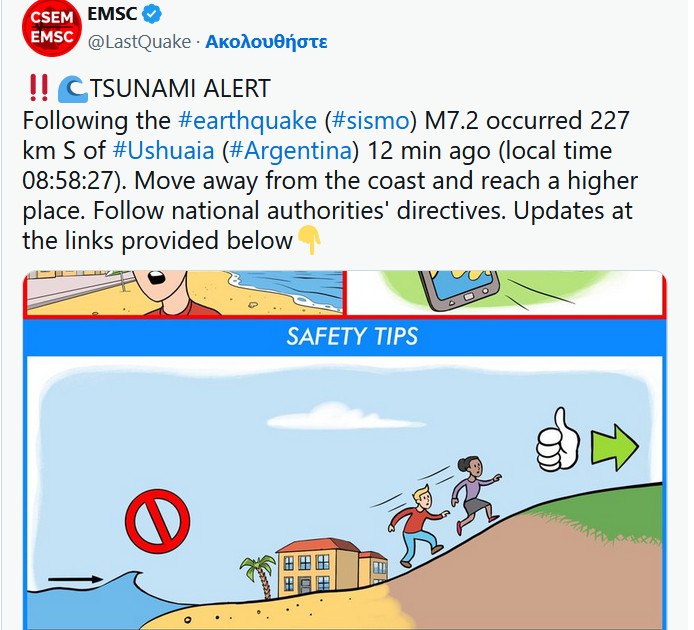 Το EMSC με ανάρτηση στο tweet, εξέδωσε και οδηγίες για τους κατοίκους με σκοπό να προφυλαχθούν από το τσουνάμι.
