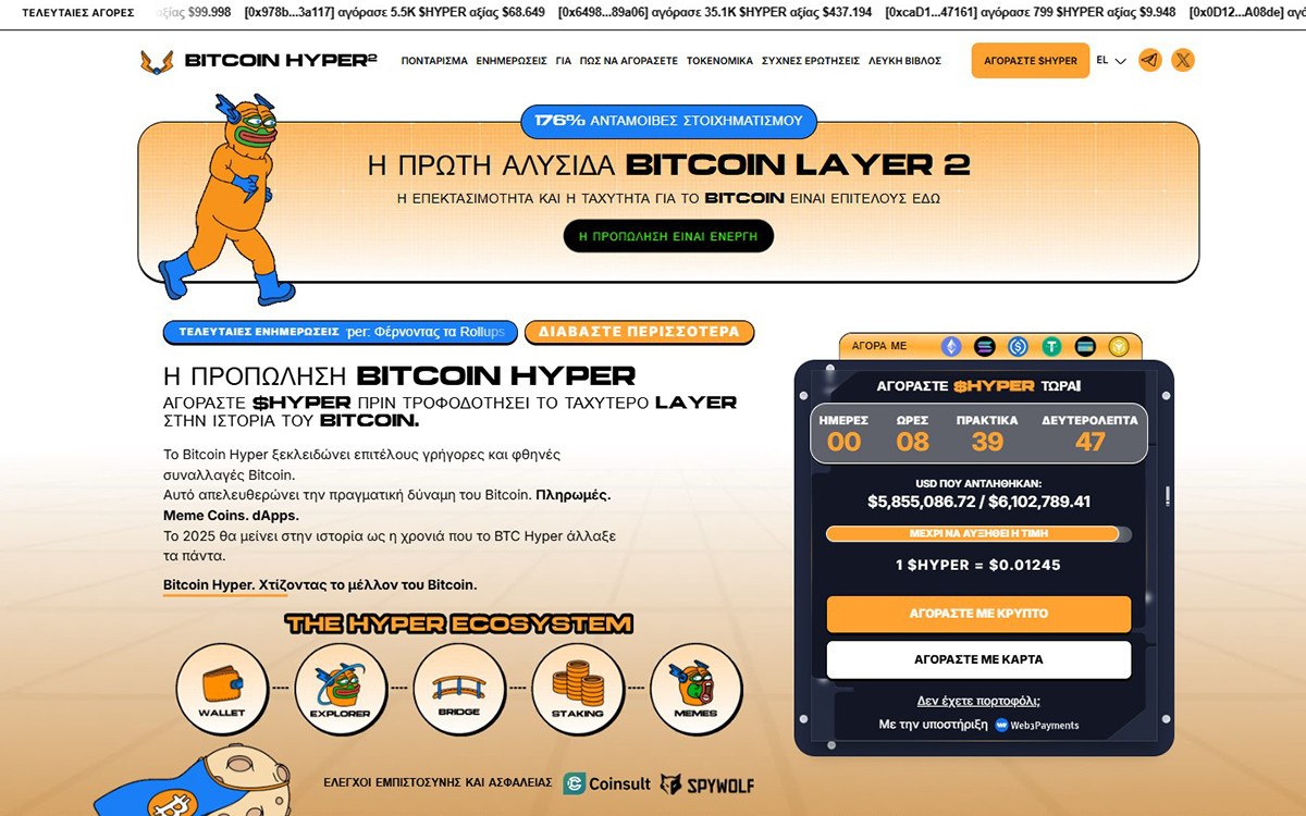 Το Bitcoin Hyper ($HYPER) φέρνει λειτουργικότητα στο Bitcoin, προσφέροντας ένα Layer-2 δίκτυο που επιτρέπει staking, έξυπνα συμβόλαια και dApps. Με τιμή που παραμένει χαμηλή και αυξανόμενο ενδιαφέρον από κοινότητες που επενδύουν σε utility-based tokens, το $HYPER δείχνει όλα τα σημάδια πρώιμης ανόδου. Η δραστηριότητα των κατόχων BTC που αναζητούν απόδοση στα κεφάλαιά τους είναι πιθανό να οδηγήσει σε νέα ροή επενδυτών προς το Hyper οικοσύστημα.