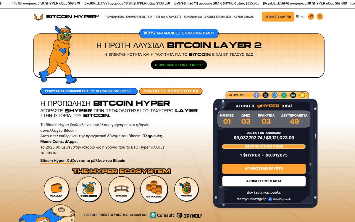Το Bitcoin Hyper ($HYPER) είναι το πρώτο Layer-2 δίκτυο που αξιοποιεί το Solana Virtual Machine στο δίκτυο του Bitcoin, φέρνοντας έξυπνα συμβόλαια και αποκεντρωμένες εφαρμογές στο οικοσύστημά του. Με δυνατότητες staking, canonical bridge για wrapped BTC και χαμηλά τέλη συναλλαγών, το έργο στοχεύει να καλύψει κενά που το Bitcoin αδυνατεί να καλύψει μόνο του. Η χαμηλή τιμή αγοράς στο presale και η αναμενόμενη υιοθέτηση από developers, καθιστούν το $HYPER μια από τις πιο ελκυστικές επιλογές του καλοκαιριού.