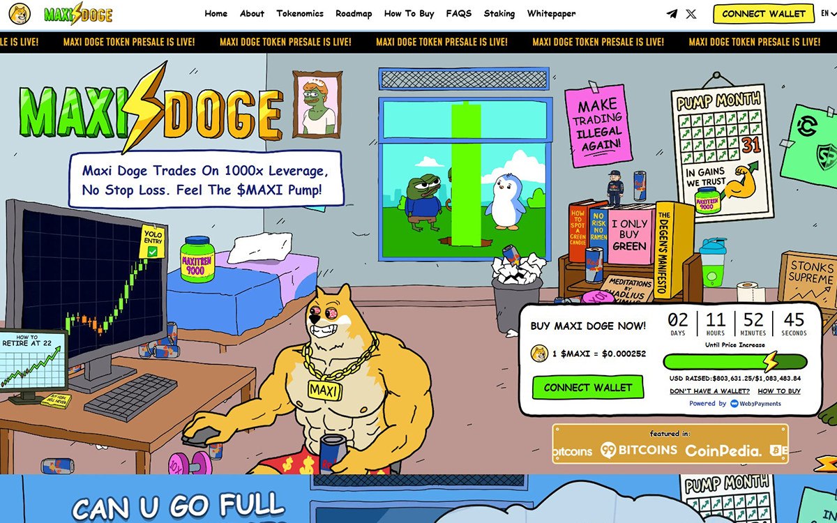 Το Maxi Doge ($MAXI) είναι ένα σατιρικό meme coin που απευθύνεται σε φανς του γυμναστηρίου και degens traders, βασιζόμενο στην κουλτούρα “Proof of Workout / Proof of Winning”. Βρίσκεται σε presale με ιδιαίτερα χαμηλή τιμή, προσφέροντας παράλληλα staking και ανταμοιβές. Χωρίς roadmap ή υπερβολικές υποσχέσεις, ποντάρει στο branding, την κοινότητα και το trading hype για να πετύχει.