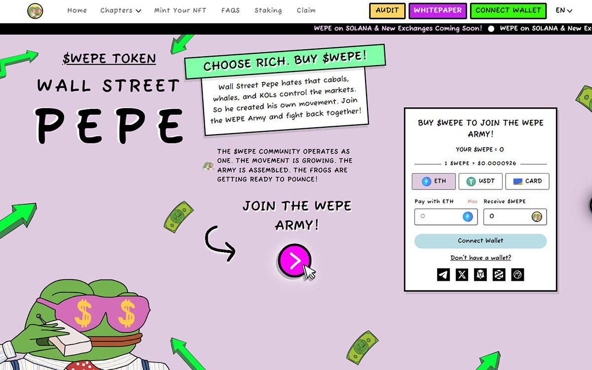 Το Wall Street Pepe ($WEPE) είναι ένα meme coin βασισμένο στο Ethereum, με trading rewards και ισχυρή κοινότητα, με το όνομα “WEPE Army”. Το project υποστηρίζεται από μεγάλες καμπάνιες marketing και συνεργασίες, ενώ έχει ως στόχο να προσφέρει τη δύναμη στους μικροεπενδυτές να ανταγωνιστούν τις φάλαινες στον χώρο των crypto.