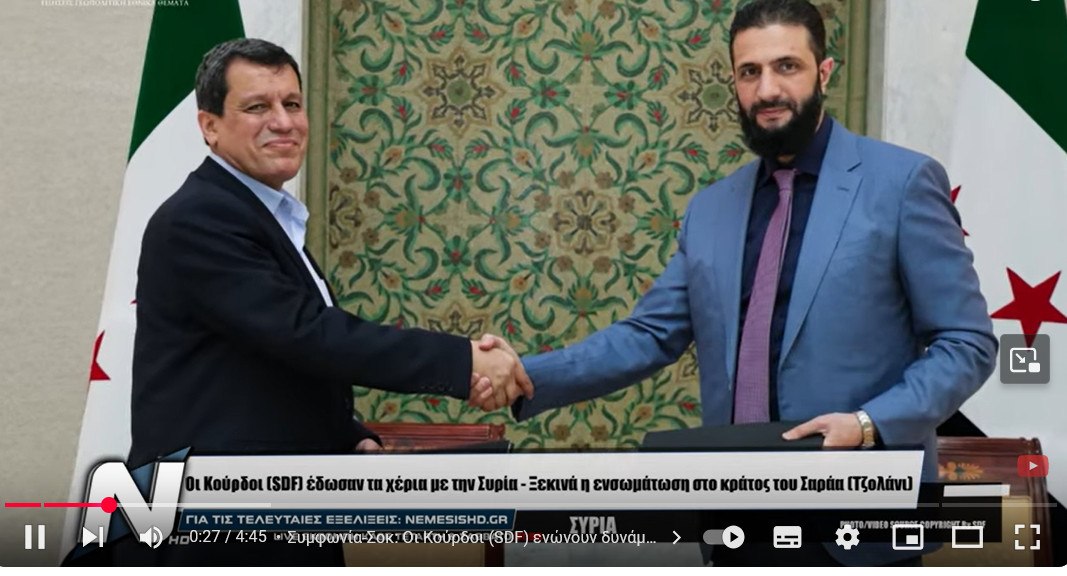 «Με βάση τη συνάντηση που πραγματοποιήθηκε μεταξύ του Προέδρου Ahmed Al-Sharaa και του κ. Mazloum Abdi τη Δευτέρα 10 Μαρτίου 2025, συμφωνήθηκαν τα ακόλουθα: