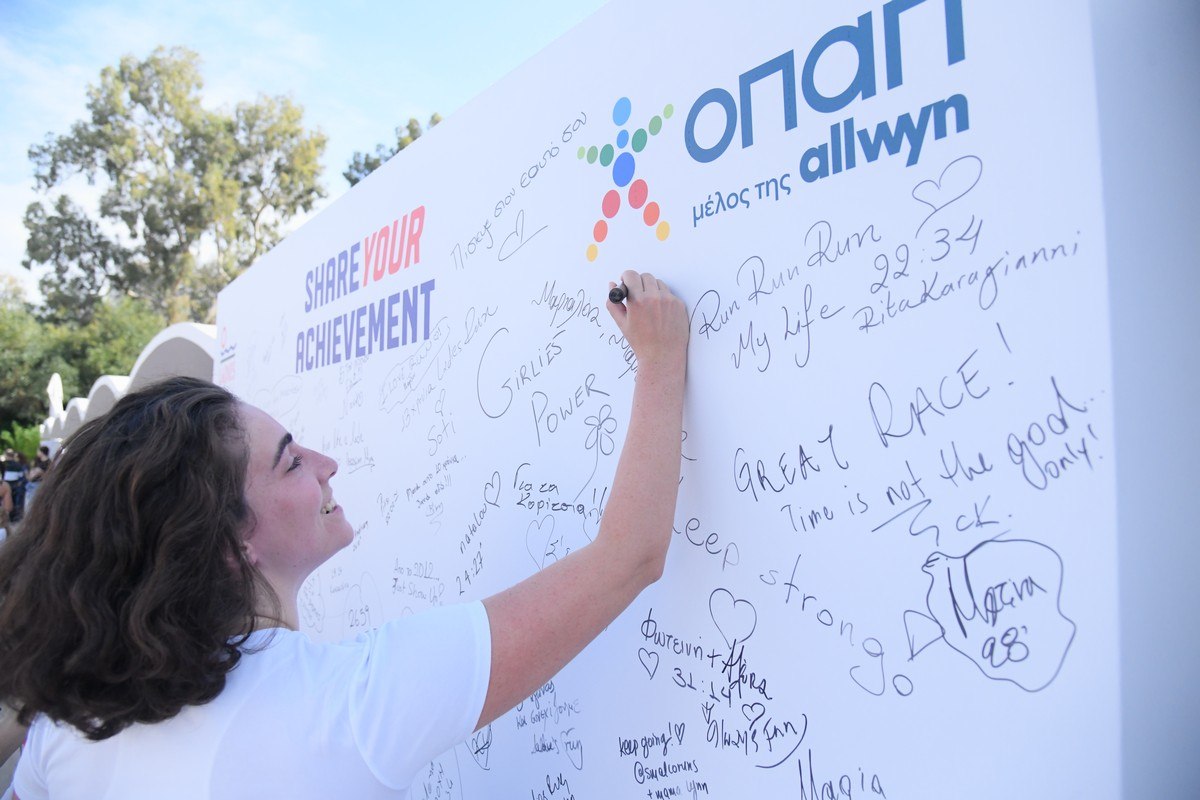 Μετά τον τερματισμό, ένας λευκός πίνακας τις περίμενε για να αποτυπώσουν το προσωπικό τους μήνυμα – λέξεις που εξέφραζαν τη χαρά, τη δύναμη και τον σκοπό της συμμετοχής τους.