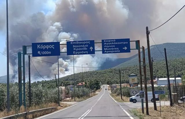 Στο μεταξύ διακόπηκε η κυκλοφορία των οχημάτων σε τμήμα της λεωφόρου Επιδαύρου, λόγω της πυρκαγιάς στο Σοφικό Κορινθίας.
