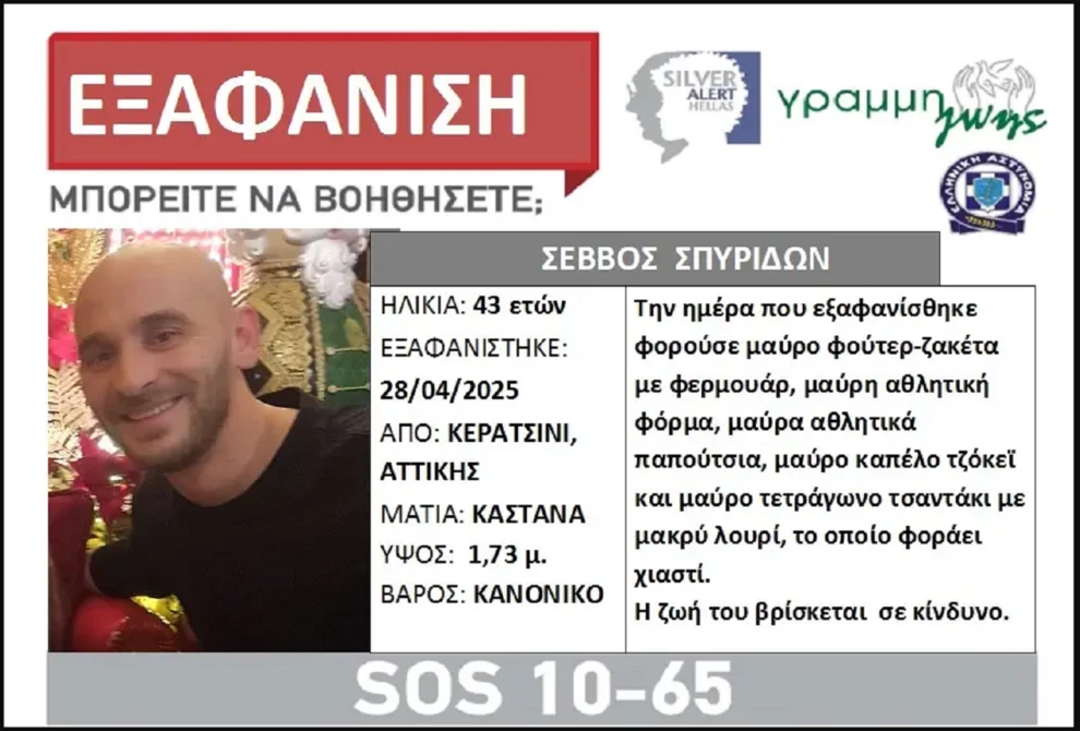 Ο Σπυρίδων Σέββος, 43 ετών, εξαφανίστηκε από το σπίτι του, στο Κερατσίνι Αττικής, το μεσημέρι της 28/04/25, όταν έφυγε για να μεταβεί στην εργασία του, στον Ταύρο Αττικής. Έκτοτε, δεν έχει δώσει σημεία ζωής.