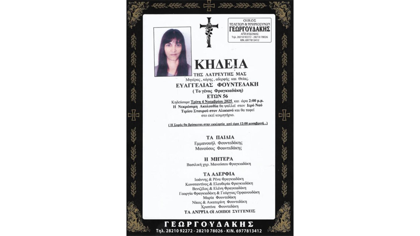 Αύριο, Τρίτη 4 Νοεμβρίου, θα τελεστεί στα Χανιά η κηδεία της 56χρονης γυναίκας της οικογένειας Φραγκιαδάκη, που τραυματίστηκε θανάσιμα από σφαίρα κατά τη διάρκεια της συμπλοκής. Η νεκρώσιμη ακολουθία θα γίνει στον Ιερό Ναό του Τιμίου Σταυρού στον Αλικιανό, παρουσία συγγενών, φίλων και κατοίκων από ολόκληρη την περιοχή. Η σορός της μεταφέρθηκε χθες το βράδυ στα Χανιά, όπου οι δικοί της άνθρωποι την υποδέχθηκαν με λυγμούς.