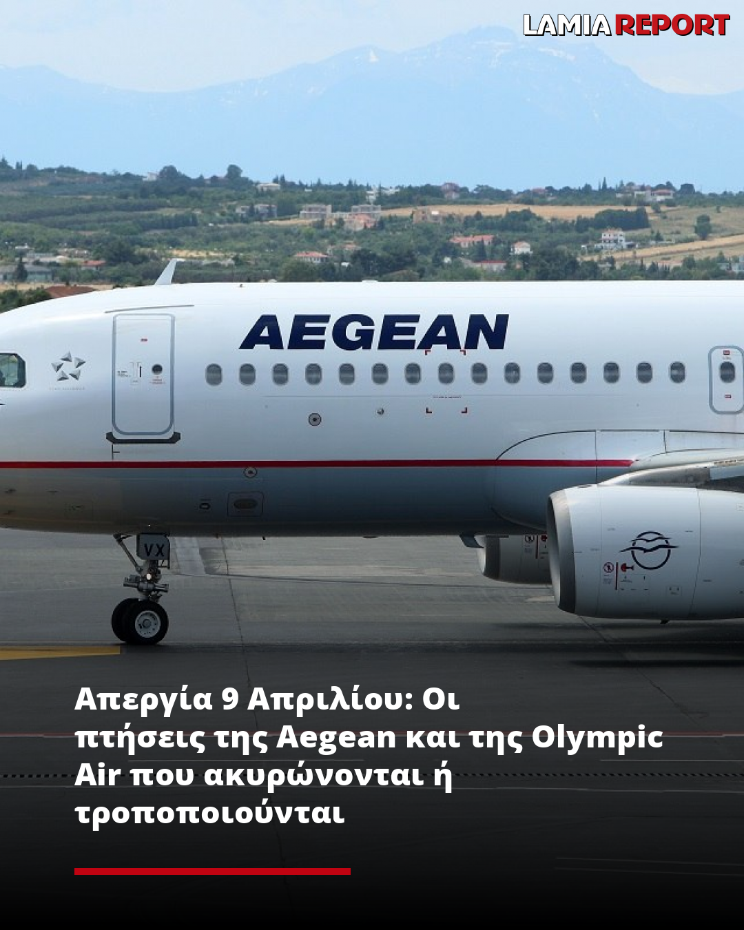 Λόγω συμμετοχής της Ένωσης Ελεγκτών Εναέριας Κυκλοφορίας Ελλάδος (ΕΕΕΚΕ) στην 24ωρη γενική απεργία που εξήγγειλε η ΑΔΕΔΥ την Τετάρτη 9 Απριλίου 2025, από 00:00 έως 23:59 τοπική ώρα, η Aegean και η Olympic Air ενημερώνουν το επιβατικό κοινό, ότι θα προβούν σε ακυρώσεις και τροποποιήσεις του συνόλου των προγραμματισμένων πτήσεων του δικτύου εσωτερικού και εξωτερικού.
