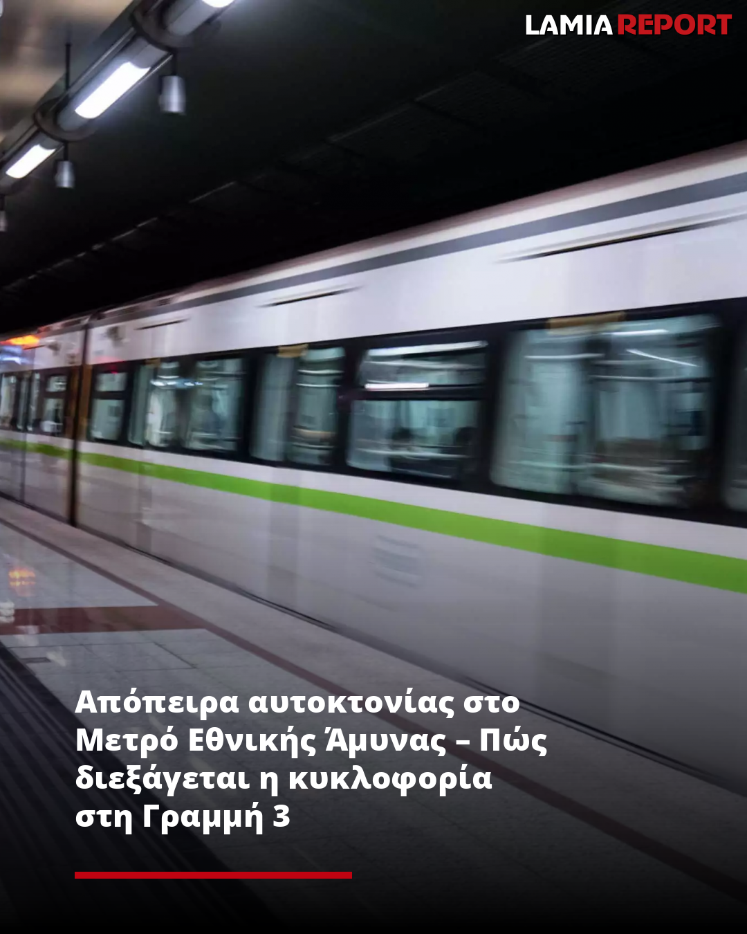 Η κυκλοφορία στη Γραμμή 3 διεξάγεται στα τμήματα Δημοτικό Θέατρο – Κατεχάκη και Δουκίσσης Πλακεντίας – Αγία Παρασκευή, λόγω απόπειρας αυτοκτονίας ατόμου στον σταθμό Εθνική Άμυνα».