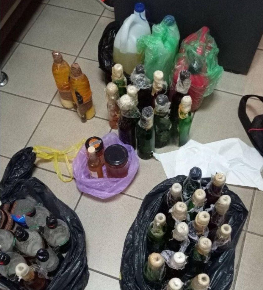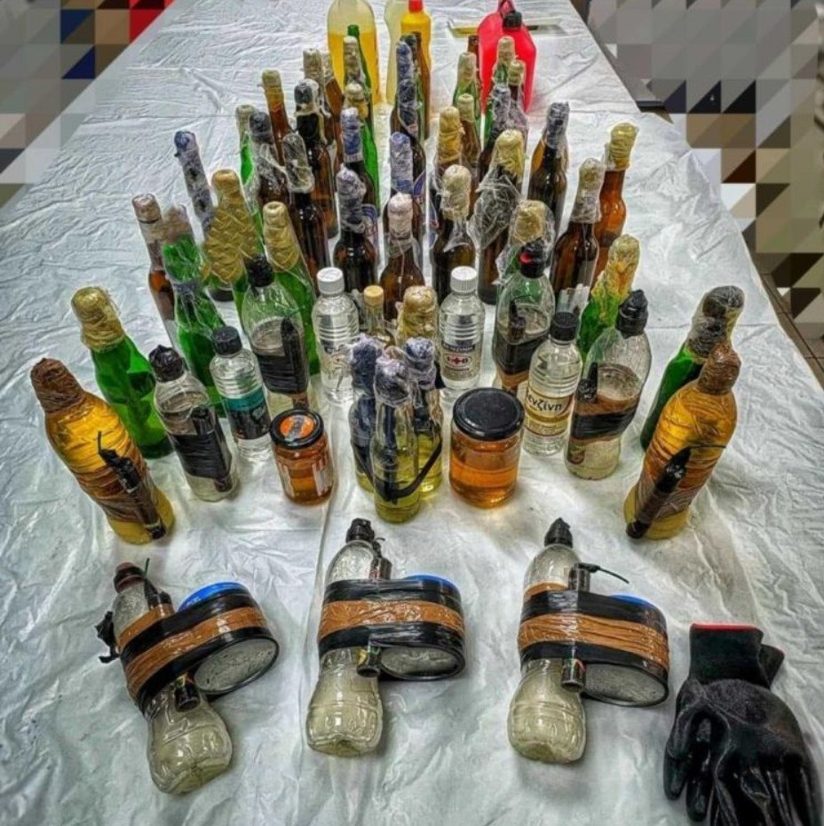 Συνολικά κατασχέθηκαν 49 ακέραιες αυτοσχέδιες εμπρηστικές – εκρηκτικές κατασκευές, 2 μπιτόνια κενά περιεχομένου με έντονη οσμή εύφλεκτου υλικού, μπιτόνι με εύφλεκτο υγρό, ιατρική μάσκα μιας χρήσης, 3 ζευγάρια γάντια, κατά περίπτωση, εργασίας και μιας χρήσης, 5 σφουγγάρια, 3 γυάλινες φιάλες κενές περιεχομένου, 4 πλαστικές φιάλες που έφεραν την ένδειξη «βενζίνη» και πλήθος τεμαχίων υφάσματος (ρετάλια).
