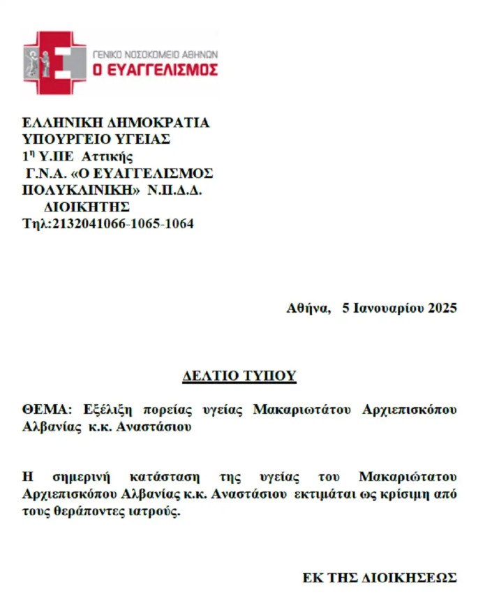 Νωρίτερα σήμερα (05/01/2025) ο Πρωθυπουργός Κυριάκος Μητσοτάκης επισκέφθηκε το νοσοκομείο «Ευαγγελισμός» στο οποίο νοσηλεύεται ο Αρχιεπίσκοπος Αλβανίας, Αναστάσιος.