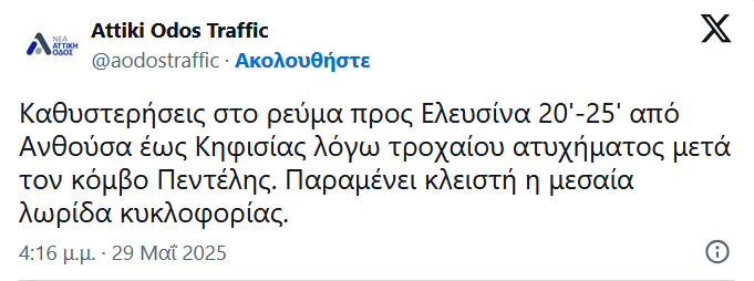 «Καθυστερήσεις στο ρεύμα προς Ελευσίνα 20′-25′ από Ανθούσα έως Κηφισίας λόγω τροχαίου ατυχήματος μετά τον κόμβο Πεντέλης.