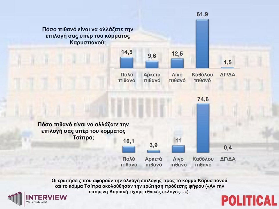 Στην ερώτηση αν την επόμενη Κυριακή είχαμε εθνικές εκλογές, πόσο πιθανό είναι να αλλάζατε την επιλογή σας υπέρ του κόμματος Καρυστιανού, κυριάρχησε το "καθόλου πιθανό" με ποσοστό 61,9% ενώ στην ίδια ερώτηση για το κόμμα του Αλέξη Τσίπρα, το "καθόλου πιθανό" λαμβάνει ποσοστό 74,6%.