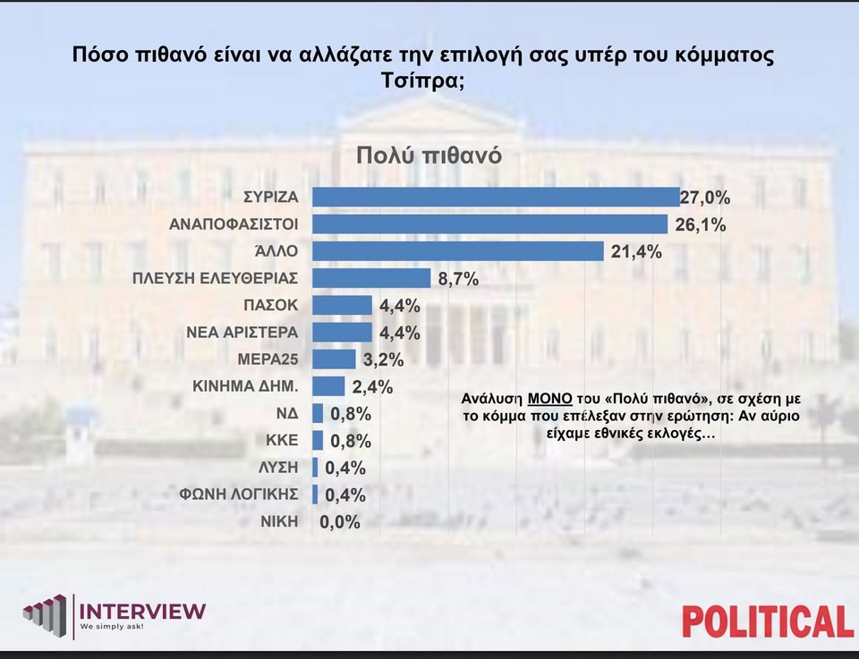 Όσον αφορά τους ψηφοφόρους που επέλεξαν "πολύ πιθανό" να ψηφίσουν το κόμμα του Αλέξη Τσίπρα, το 27% προέρχεται από τον ΣΥΡΙΖΑ, το 25,1% είναι αναποφάσιστοι και ακολουθεί «άλλο» με 21,4%.